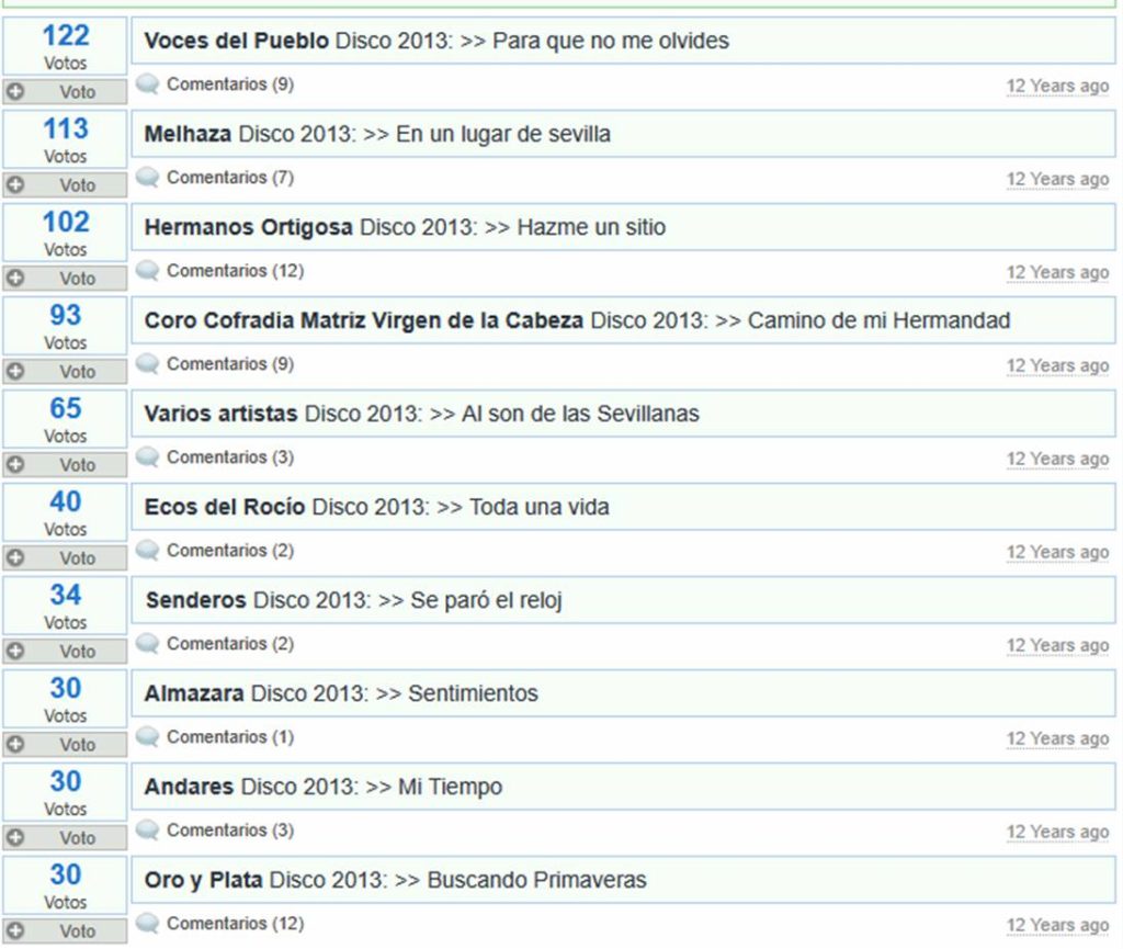 Tras la salida de los discos de sevillanas de ese año, y durante los meses de verano, nuestros oyentes participaron con sus votos para elegir a sus artistas y temas favoritos. Aquí puedes ver el resultado final.